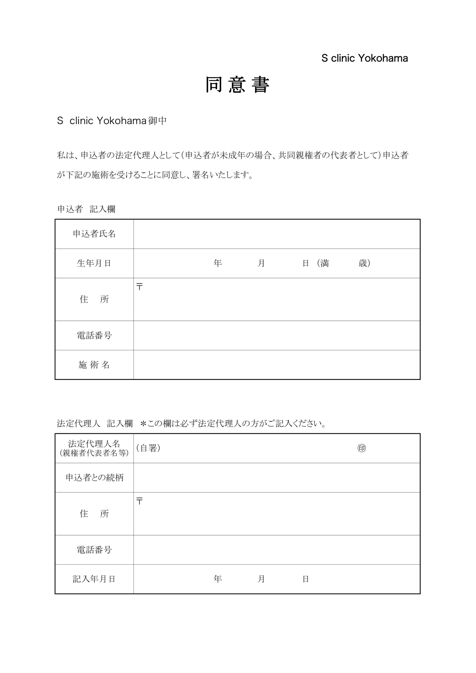 ご来院時に保護者の方の同伴が無い場合、保護者の方の同意書が必要となります。
