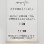 📣診察時間延長のお知らせ(金曜日のみ) 2025.10.16 診察時間延長のお知らせ📢 当院では毎週金曜日の篠田院長施術のみで診察時間を延長することになりました❤️🔥 毎週金曜日 9:00-19:00 (篠田院長施術のみ) 看護師施術は17:00までですのでご注意ください。 お仕事終わりの方にもご来院いただけます✌🏻 ご不明な点がございましたらお気軽にお問い合わせくださいませ!