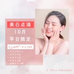10月平日限定‼️美白点滴SALE♡ 2025.09.29 通常¥5,500→¥3,300‼️ 大変お得にお受けいただけます☺️ 皆様のご予約、心よりお待ちしております♡ ※平日限定のお値段となりますので、ご予約時はご注意お願いいたします。